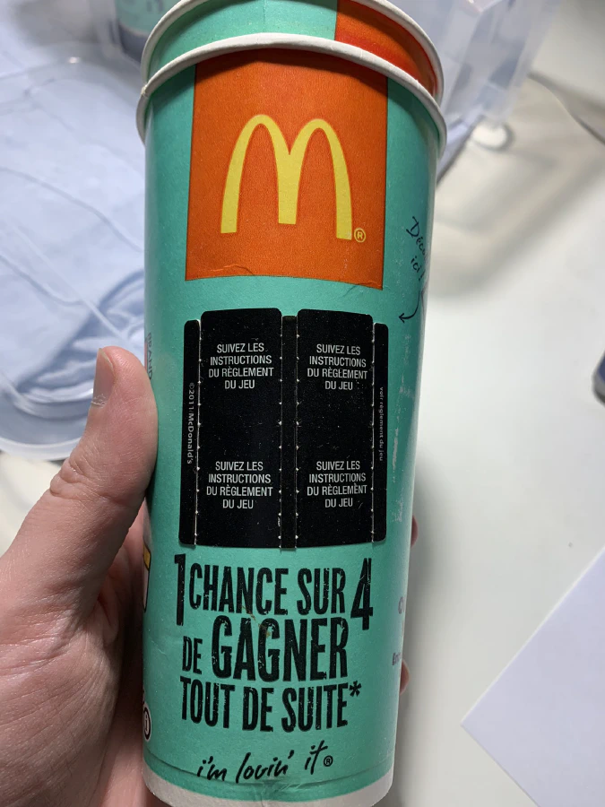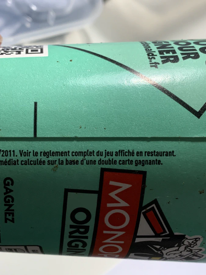 But the fine print on the cups was hard to read: it was written vertically and with a tiny font size. Because the cups are filled with healthy high-sugar sodas like Coca-Cola, you can’t really put your cup horizontally to read what was written vertically. Anyway it says that the basis of the calculation is a “double winning sticker” (“double carte gagnante” in French).